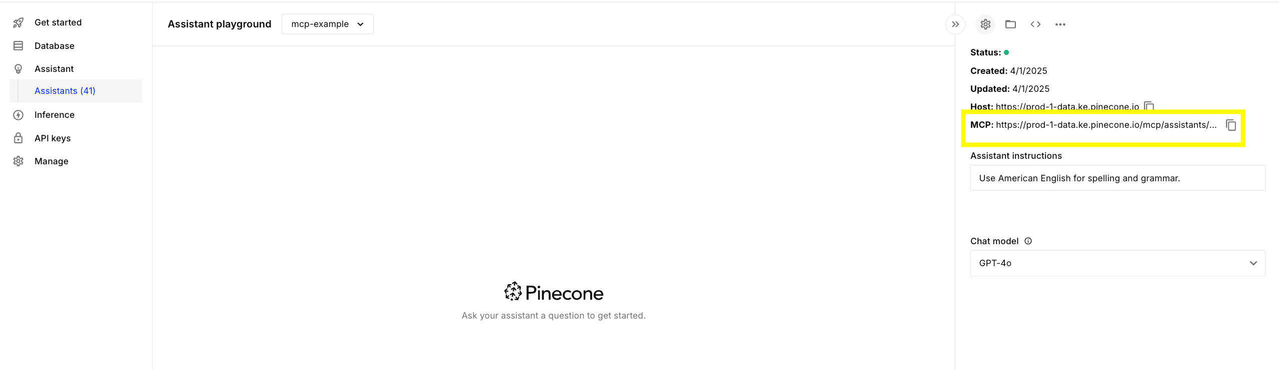 You can also find the MCP endpoint on the Assistant page in the Pinecone console: