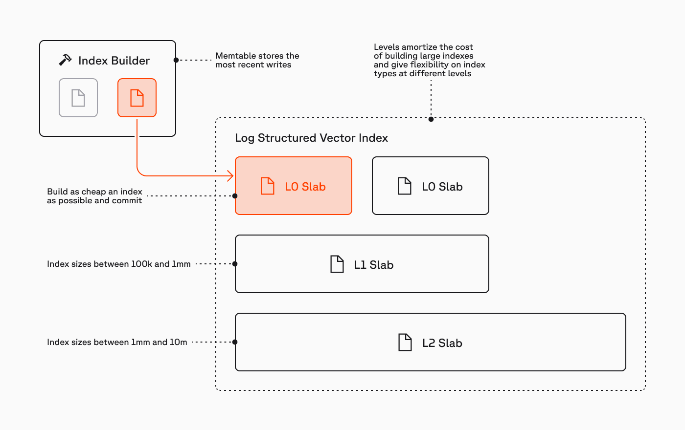 Writes are first recorded in an in-memory structure called a memtable, which periodically flushes to blob storage, creating an L0 slab once it reaches a predefined size threshold. Since the goal is to make the L0 slabs indexed and queryable as soon as possible, we employ fast indexing techniques like scalar quantization or random projections at this level.