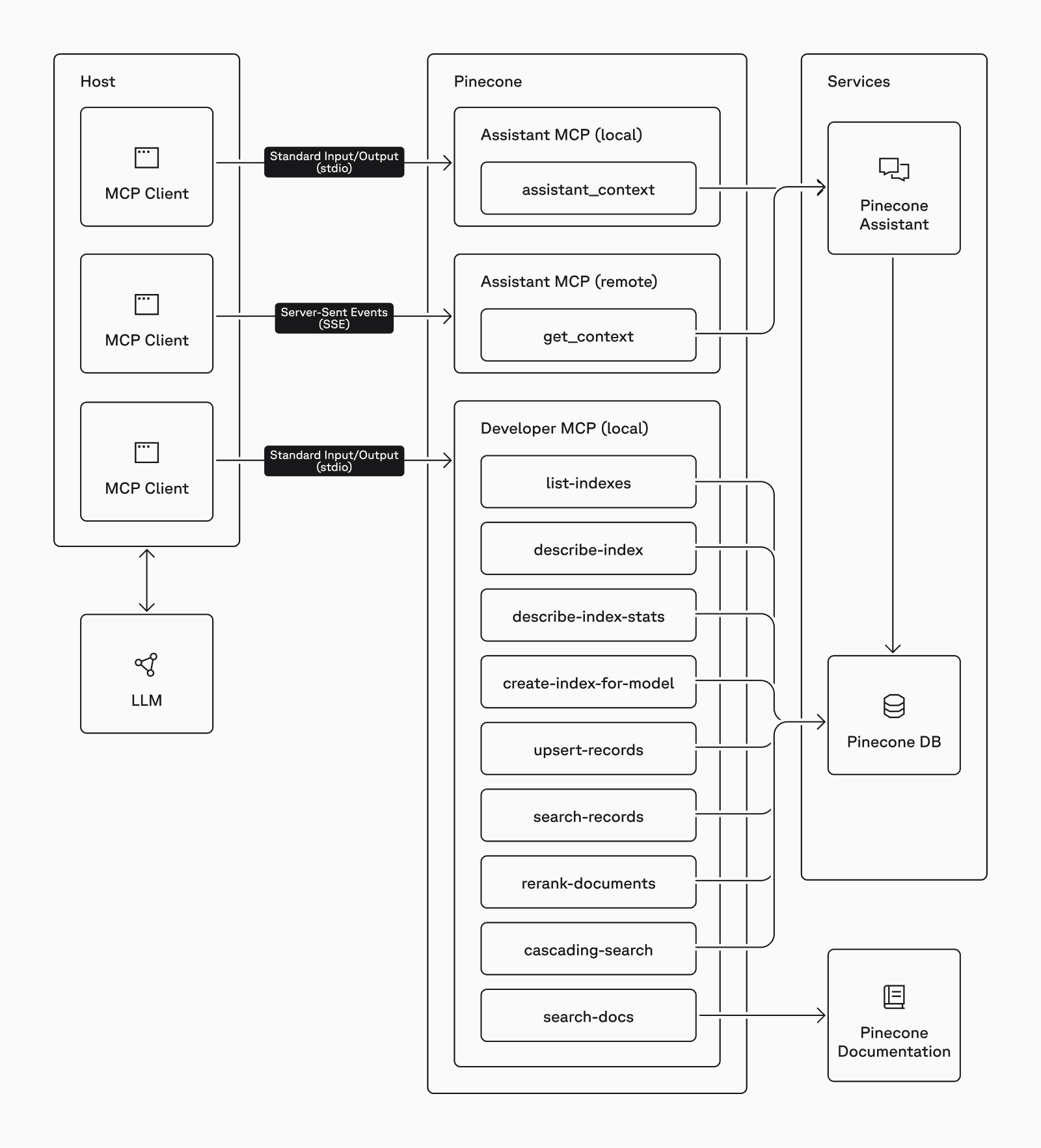 How it solves it is probably best explained by example. The following diagram shows how an application interacting with an LLM can make use of the MCP servers provided by Pinecone.