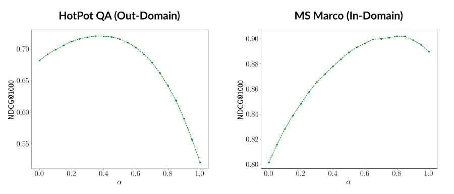 Our research shows the impact of hybrid search on relevance compared to standalone keyword and semantic search: Whether searching in-domain or out-of-domain from the original training data, the hybrid results are better across the board.