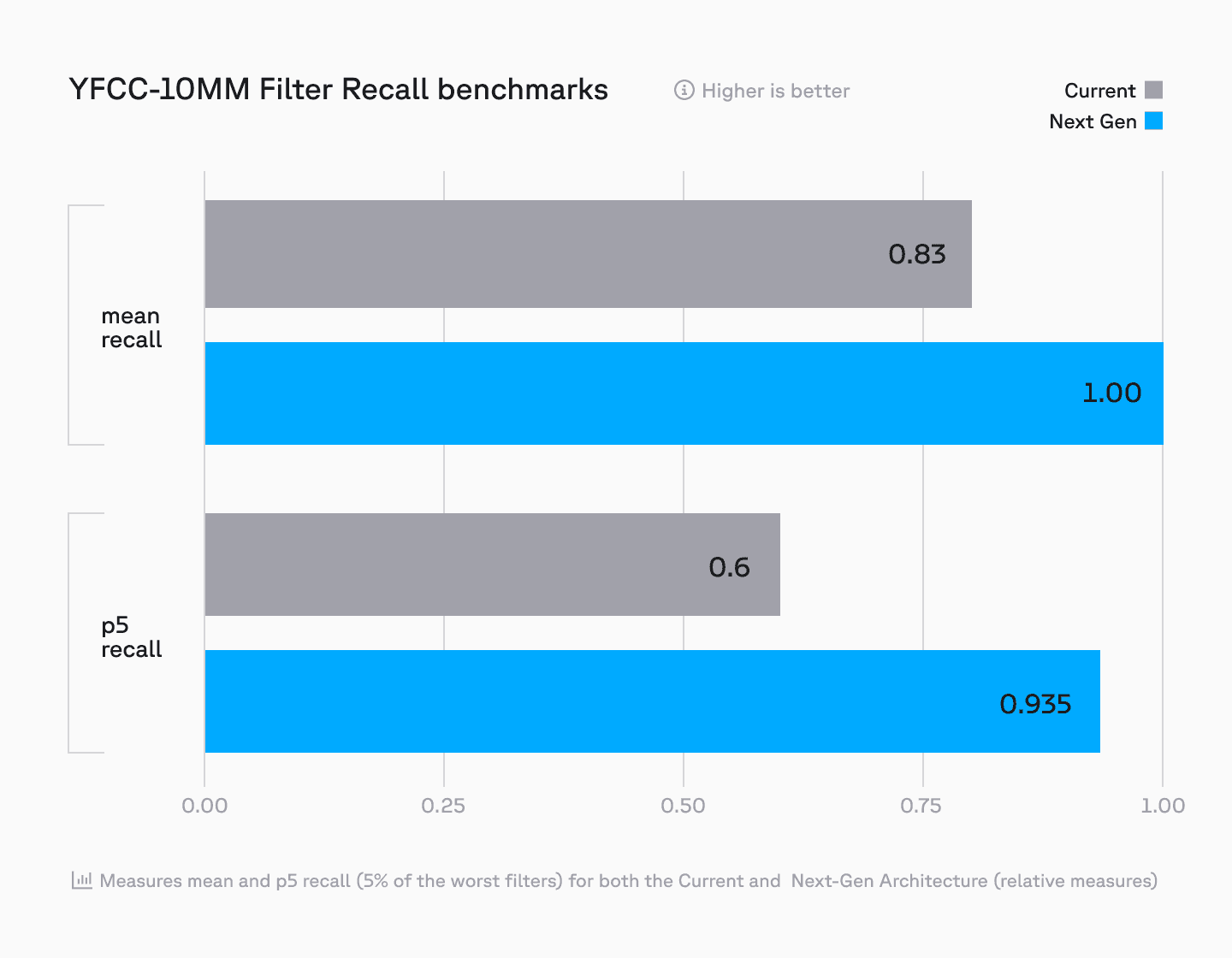 Metadata filtering is commonly used alongside vector search. It improves relevance by specifying which records to include or exclude from the search. Pinecone’s new disk-based metadata filtering allows for scaling metadata filtering while reducing the overall memory footprint. In addition to reducing memory usage, disk-based metadata filters enable high cardinality filters to be applied efficiently, improving recall.