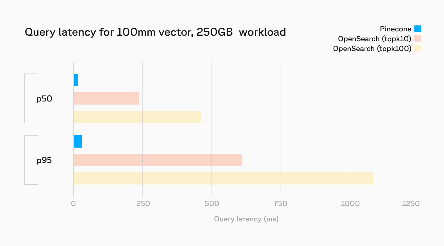 Pinecone serverless provides low latency even when operating at scales over 100M vectors, at query levels exceeding 1000 QPS. We benchmarked on a real-world use case – recommendations based on user-generated reviews at a 100m record scale. Here we compared Pinecone serverless against an OpenSearch cluster comprised of 6 r5.12xlarge nodes, with 48 vCPU and 384 GB of memory per node. This cluster translates to roughly twice the size of the Pinecone instance, with Pinecone serverless still showing better performance on an absolute scale.