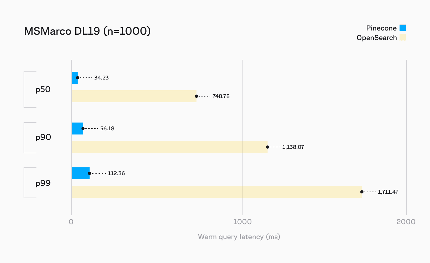 Pinecone's performance for sparse search outperforms existing search systems such as OpenSearch. Using sparse embeddings produced by the pinecone-sparse-english-v0 model for the MS Marco DL19 dataset of 8.9M vectors, we performed the following benchmarks on an OpenSearch cluster running a single r7g.large.search node. We compared these to the newly available Pinecone sparse vector index type running on similar hardware.