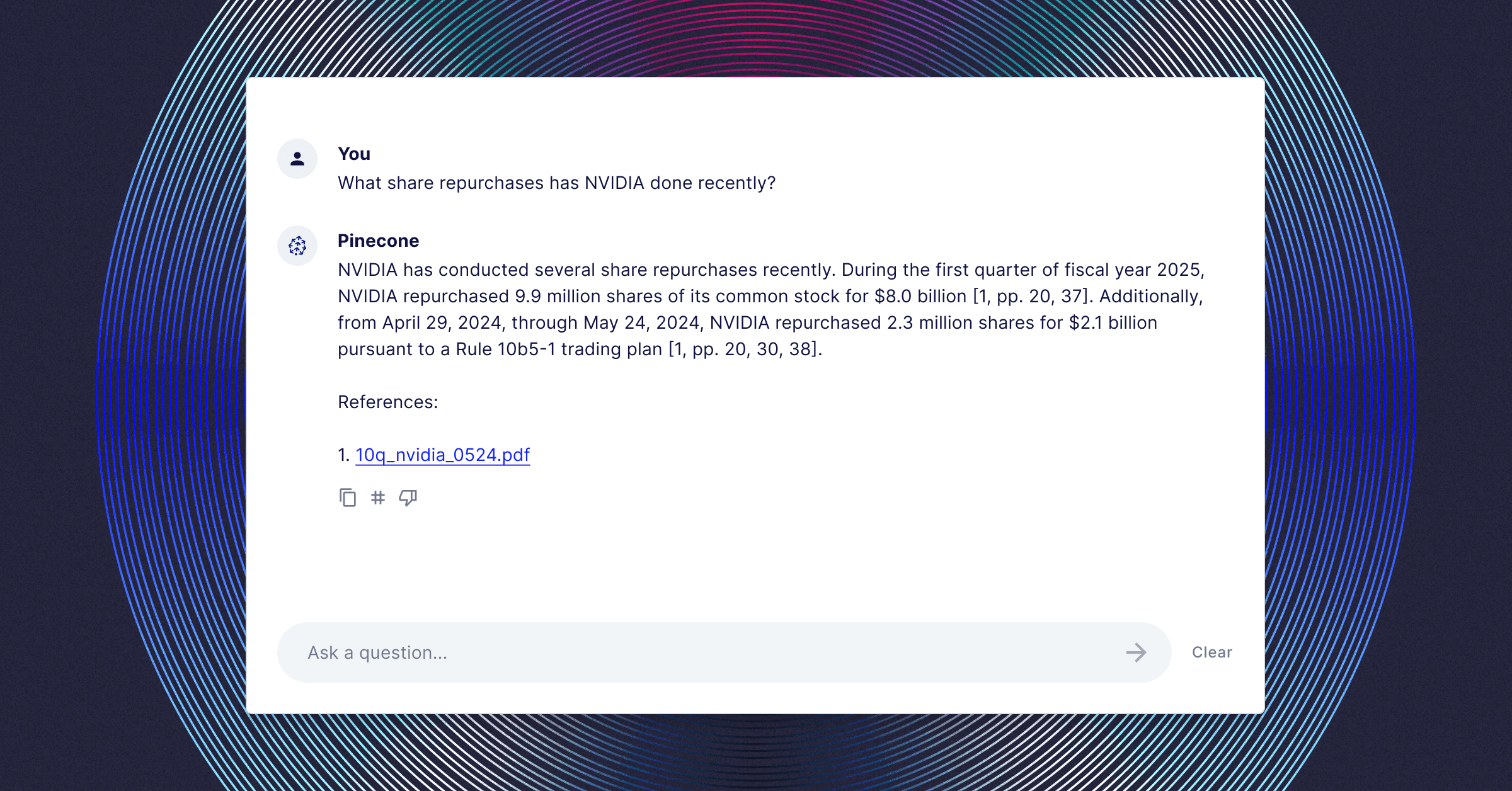 Pinecone Assistant gives you a better way: Just upload your PDF or text files (support for other file types coming soon) and start asking questions. Prototype quickly with the drag-and-drop upload and chat interface, then add it to your applications in a matter of minutes with the chat-completion-compatible API.