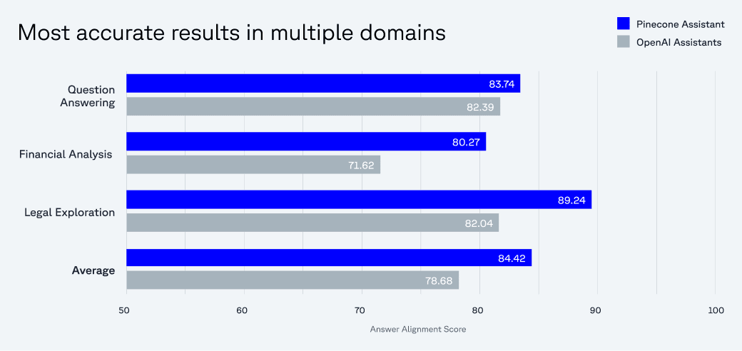 The underlying serverless architecture, intuitive interface, and built-in evaluation and benchmarking framework make it easy to get started (just upload your raw files via a simple API), quick to experiment and iterate, and effortless to scale and maintain. We’ve optimized the workflow end-to-end to ensure you have access to accurate, grounded information at every step—from document ingestion to query planning and reasoning to response generation. In fact, our benchmarks show Pinecone Assistant delivers up to 12% more accurate results than OpenAI Assistants.