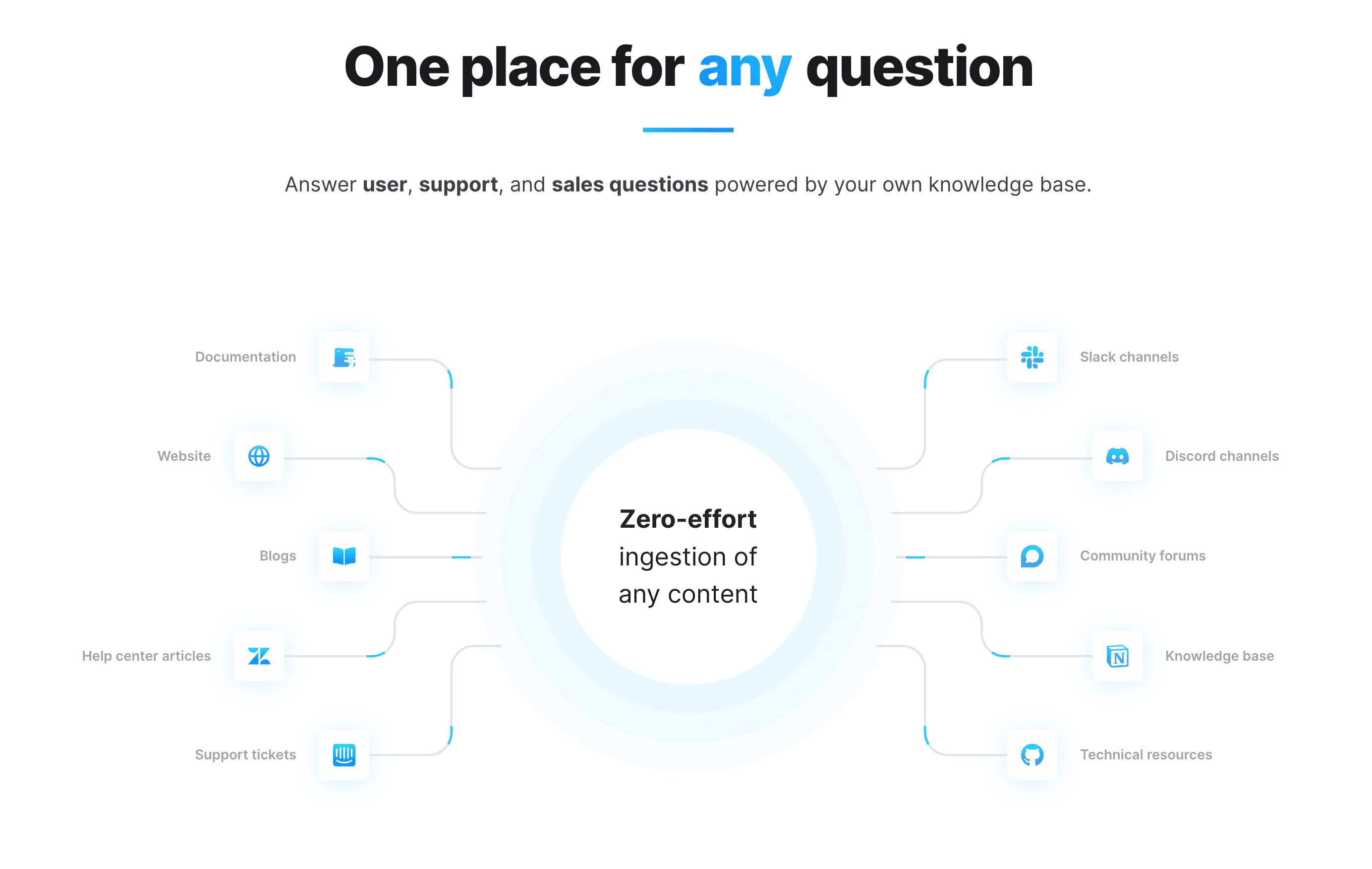 When we decided to start a company, we wanted to focus on developer products, a market that often gets overlooked. During our research, we noticed a gap: while most B2B SaaS products use chatbots like Intercom or Zendesk, only about 20% of developer companies do. Developers often see these chatbots as marketing tools, not helpful resources. Our original motivation was to create a product designed for developers that provides immediate, helpful answers without the marketing and sales stigma of traditional chatbots. We’ve since found that that approach actually resonated with many companies with technical products and savvy (or picky) end-users; in particular, if they have high support volumes and tons of content.