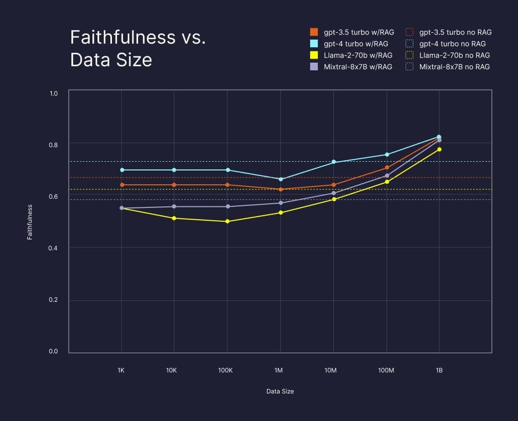 After a certain threshold, using the LLM with RAG led to more “faithful” — roughly speaking: more useful and accurate — answers than using the LLM alone, and it kept improving with larger index sizes. By the 1B mark, using RAG reduced unfaithful answers from GPT-4 by around 50%. The effect on other LLMs was even greater, actually making up for any original difference in quality between them and GPT-4.