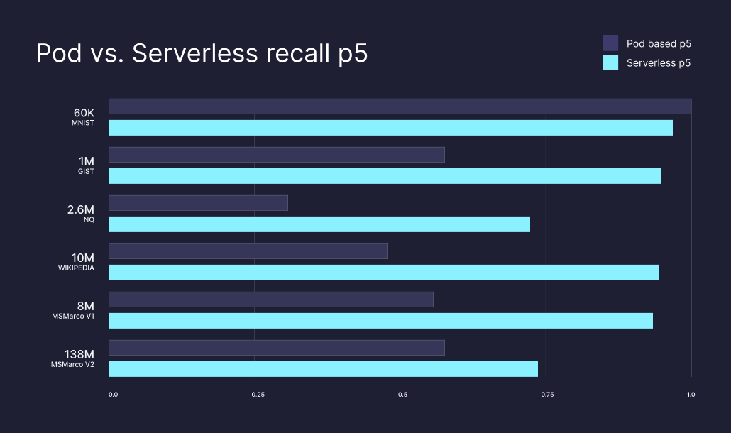 Our best gains came from improving many of our “worst case” recall performances. At p95 (the majority of calls), Serverless and pod-based return similar recall performance, but our worse-case performances (p50 and p5) are significantly improved.