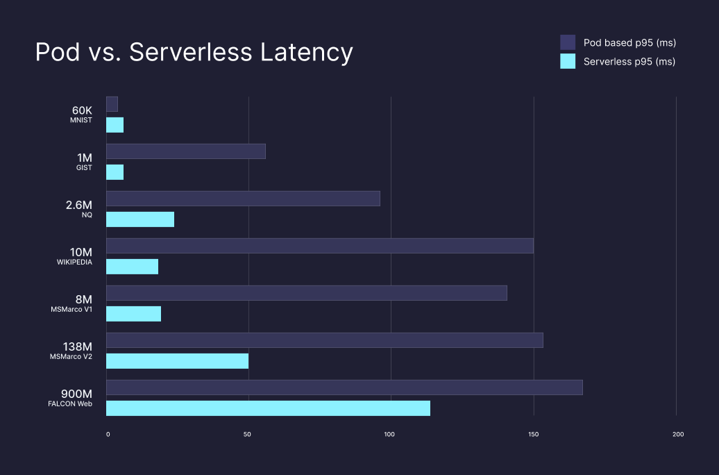 We collected some benchmarks that compare our pod-based architecture to Pinecone serverless. In due course, we will also release a benchmarking suite along with our methodology for benchmarking vector databases so anyone can reproduce these benchmarks and use them to compare other vector databases and traditional databases on the workloads that matter.