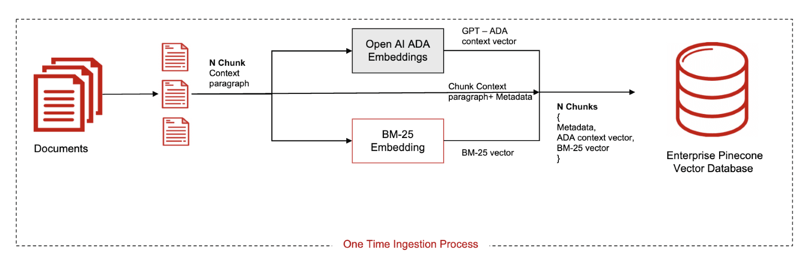The workflow for Agent Assist begins by scraping financial documents stored as HTML pages and preprocessing them with a custom chunking strategy. From there, dual dense and sparse embeddings are created, with sparse embeddings trained in-house using BM25. The embeddings and their metadata are ingested and stored in Pinecone serverless. Once indexed, the data is queried via hybrid retrieval with Alpha set at 0.5 for optimal precision, especially for financial documents with domain-specific terms and abbreviations.