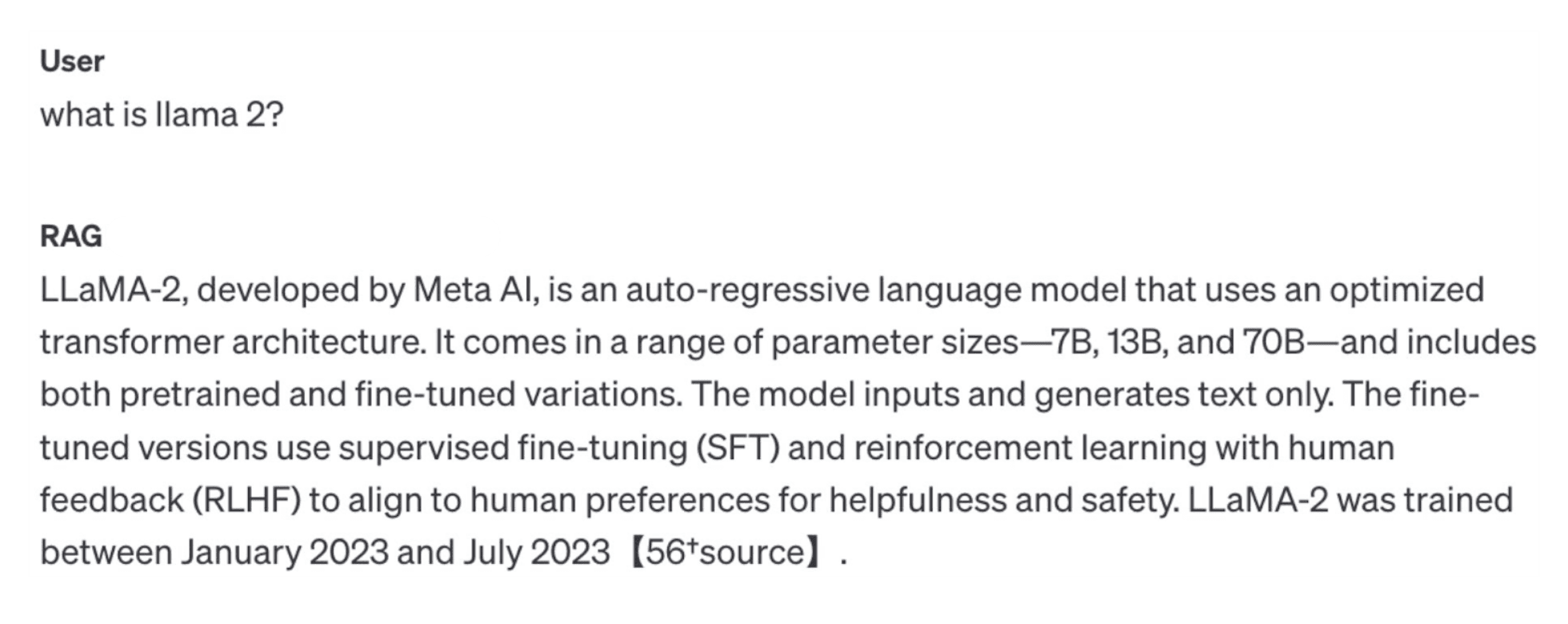 We get a good overview of GPT-3.5, but the model cannot answer our question about Llama 2. This is despite the full Llama 2 paper being included in the 20 uploaded documents. Just to confirm the Llama 2 paper was among the uploaded documents, we asked this follow-up question: