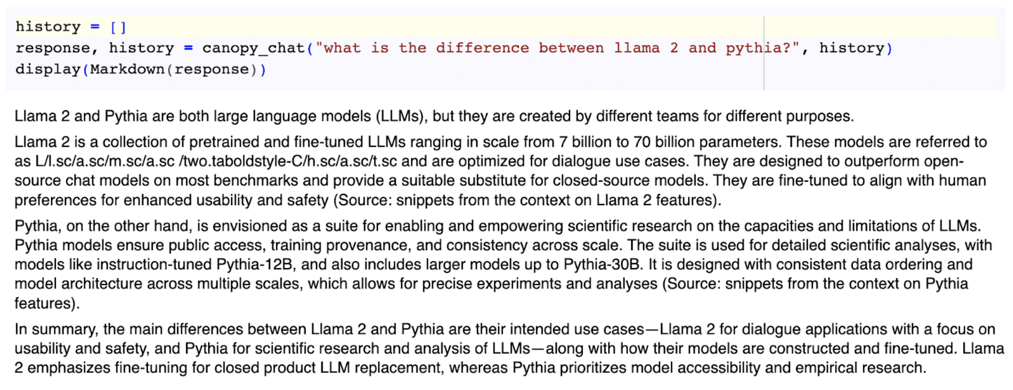 On the other hand, Canopy answered our question using information it found for both GPT-3.5 and Llama 2.