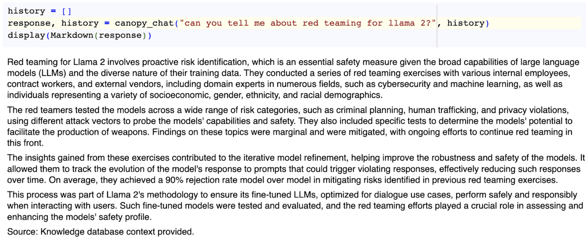 For example, we asked about the red-teaming efforts of Llama 2 development — a big topic within the Llama 2 paper. Here is the answer from Assistants API: