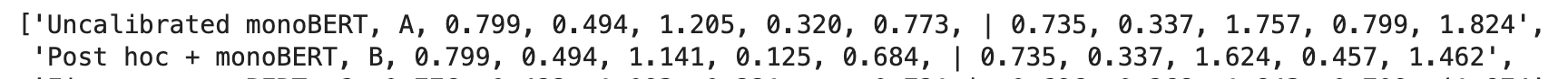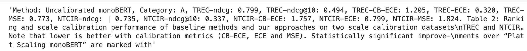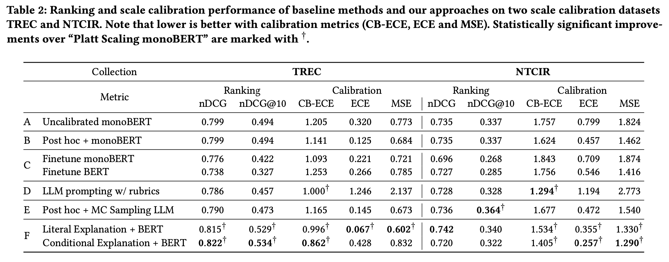 Method: Literal Explanation + BERT, Category: F, TREC-ndcg: 0.815*, TREC-ndcg@10: 0.529%, TREC-CB-ECE: 0.996°, TREC-ECE: 0.067*, TREC-MSE: 0.602" |, NTCIR-ndcg: 0.742, NTCIR-ndcg@10: 0.340, NTCIR-CB-ECE: 1.534", NTCIR-ECE: 0.355, NTCIR-MSE: 1.3307. Table 2: Ranking and scale calibration performance of baseline methods and our approaches on two scale calibration datasets\nTREC and NTCIR. Note that lower is better with calibration metrics (CB-ECE, ECE and MSE). Statistically significant improve-\nments over “Platt Scaling monoBERT” are marked with